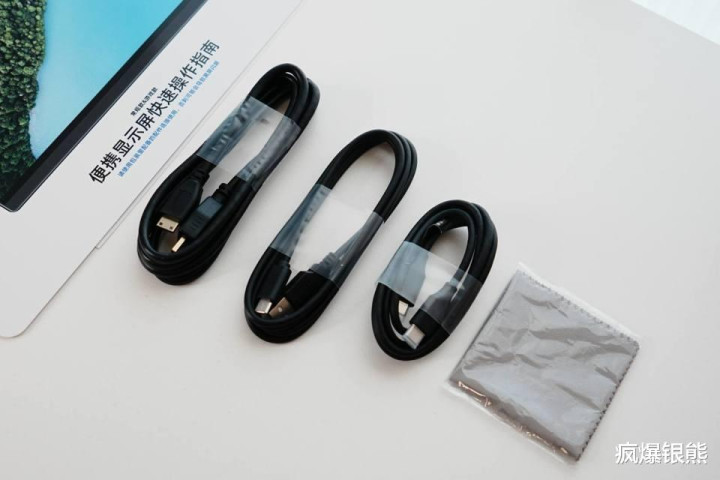 配件给的蛮丰富,送的便携包质感很好,尺寸合适,平时放个14寸笔记本都没问题。线材上一条全功能的Type-C线,支持视频输出一线通;一条HDMI转Mini HDMI信号线,接传统的PC或笔记本用;还有一根USB-A转Type-C的供电线,用于辅助供电,另外还有清洁布、说明书、保修卡。