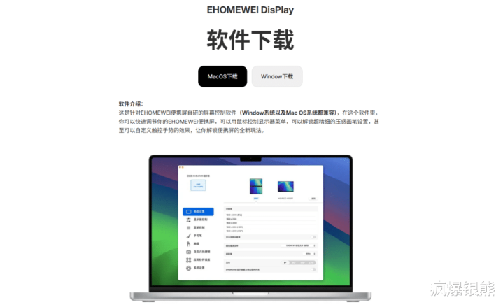 因为配备有全功能type-c接口,所以这块便携屏搭配带有雷电4/USB4接口的迷你电脑/苹果MAC mini非常舒服,一根线就能把信号输出和供电都搞定。另外这块便携屏也专门适配了EHOMEWEI Display这款软件(macOS和WINDOWS双版本很贴心)。