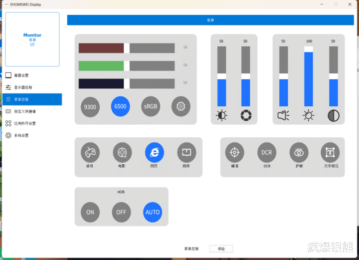 在菜单控制界面,我们可以通过鼠标快速调节OSD中的设置选项,不管是亮度、对比度还是色彩,亦或者色温、色彩模式轻轻一点就能实现,非常丝滑。